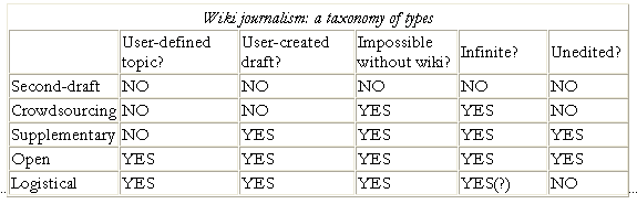 Based on a review of a number of case studies, and some literature on wikis, the paper proposes a taxonomy of wiki journalism, and outlines the opportunities and weaknesses of the form. The following is the edited highlights: