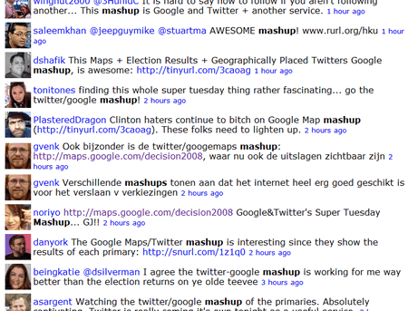 In fact there were two mashups making jaws drop. The Google Maps-Twitter-Twittervision Super Tuesday mashup flashed up any tweets related to Super Tuesday on the location they were coming from, as well as providing videos and results. It was a real time monitor of what people were doing, thinking and saying about the election – not just in the US, but internationally too.