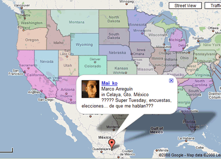 “Tell me you have seen the Google Maps/Twitter mash up of the American Super Tuesday voters.. it’s amazing! The pointer is flying all over the world, from Spain to England, and all through the various parts of America.”