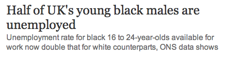 *(Notably, the online version includes a second headline which is clearer: “Unemployment rate for black 16 to 24-year-olds available for work now double that for white counterparts, ONS data shows”)