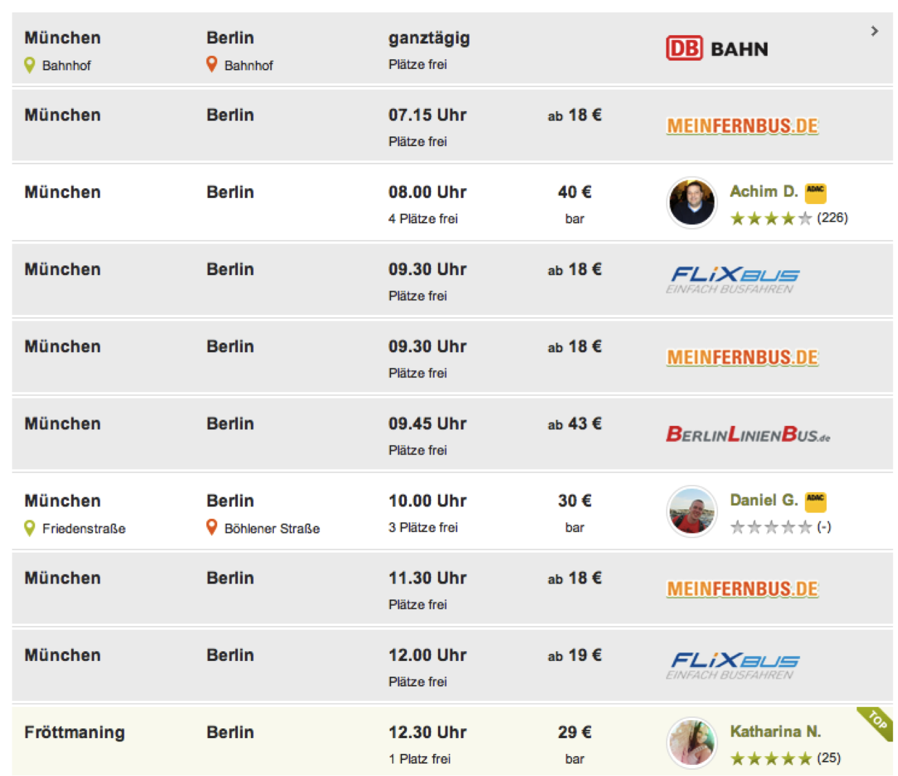 - Personalise the story and let users change their city of destination and have a look at the most common price they would have to pay or the time with the largest number of offers. Ideally, these should be a link, which would bring users direct to the particular offer at mitfahrgelegenheit.de. You could even integrate the booking form into the visualization.