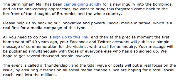 The Birmingham Mail is to invite its readers and followers to sign up today to a week-long experiment with the ‘crowdspeaking’ platform Thunderclap.