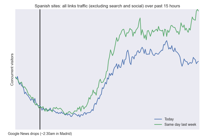Facebook and Google News. It sounds strange but the realisation that most ‘dark social’ traffic was actually Facebook traffic has changed our perception of the platform’s importance. Similar revelations about the share of traffic coming from Google News (and being lost, for Spanish publishers) have brought that to the fore.
