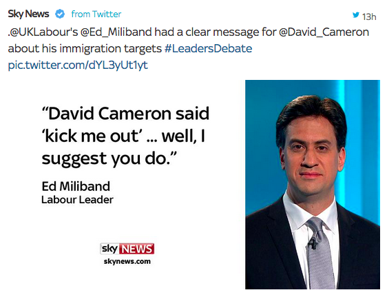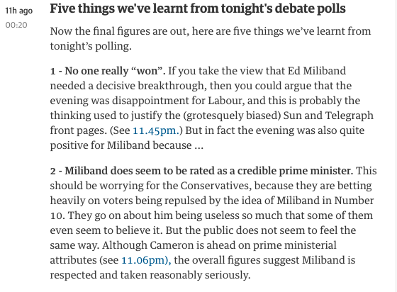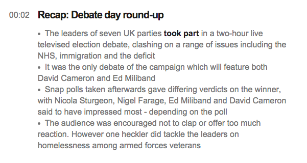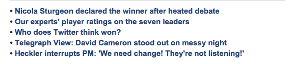 The Telegraph, for example, sums up with 5 bullet points, each linking to an article elsewhere on the site: from an analysis of Twitter reaction and another on Cameron’s performance, to a report on a heckler’s intervention, an ‘expert’ rating of how each leader did, and an article on the ‘declared’ winner of the debate overall.