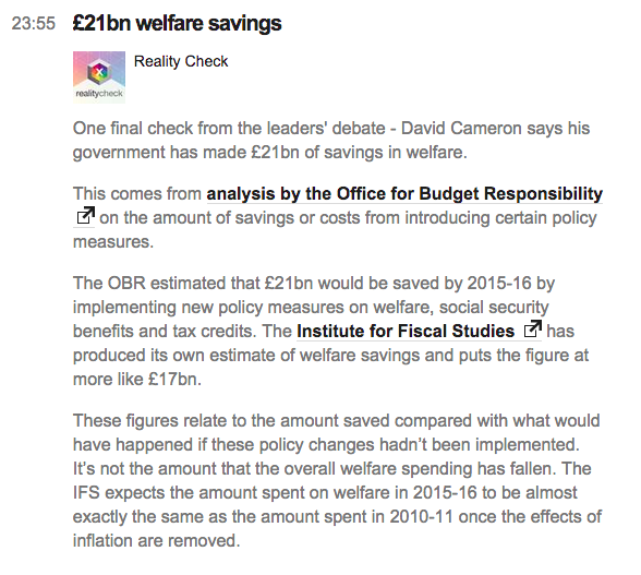 And here is the BBC factchecking a statement about welfare savings: