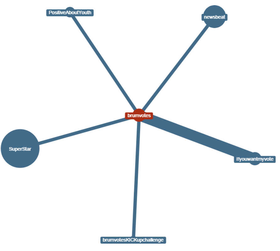 The thickness of the line, by the way, indicates the correlation: #ifyouwantmyvote, for example, is heavily correlated with #brumvotes because it was invented by the same team.