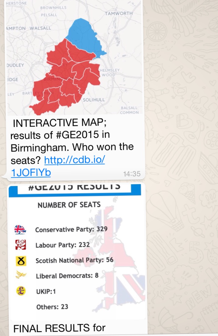 During this year’s general and local elections a collection of my Birmingham City University students used WhatsApp to publish regular updates throughout the two days of voting. Frankly… they nailed it. In the process they learned a lot, so I thought I’d share some of the things that came up throughout the process – as well as the experiences of the person responsible for the Mirror‘s political WhatsApp account in the week leading up to the election.