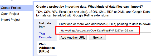 Paste the URL that you copied earlier (the Food Standards Agency XML data).