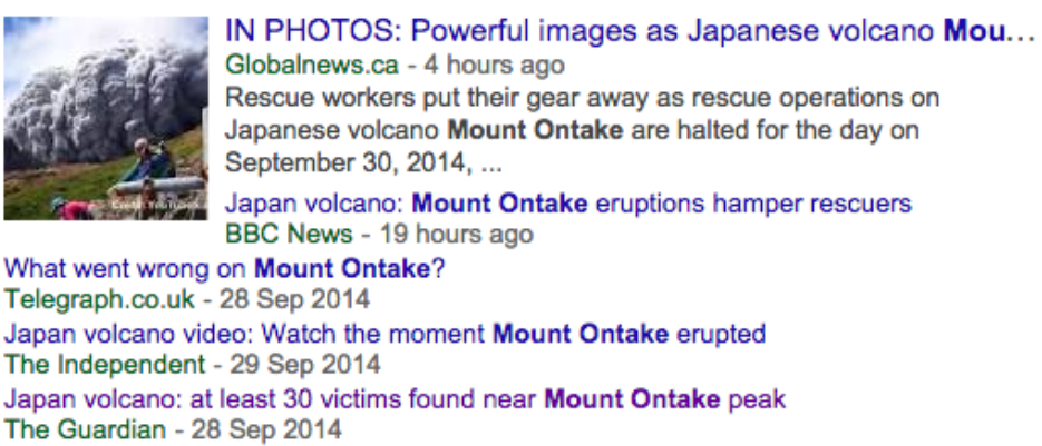 And of course the colon also gives you the opportunity to add some extra keywords too. In most of the headlines below ‘Japanese volcano’ was the most searched-for term, but the headlines hedge their bets by adding ‘Mount Ontake’ after the colon: