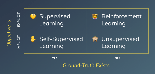 - This post proposes a fourth category and a matrix (shown above): self-supervised learning