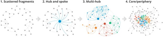 These diagrams on the Kumu blog illustrate different stages in a network’s development, but also different types of network ‘shape’