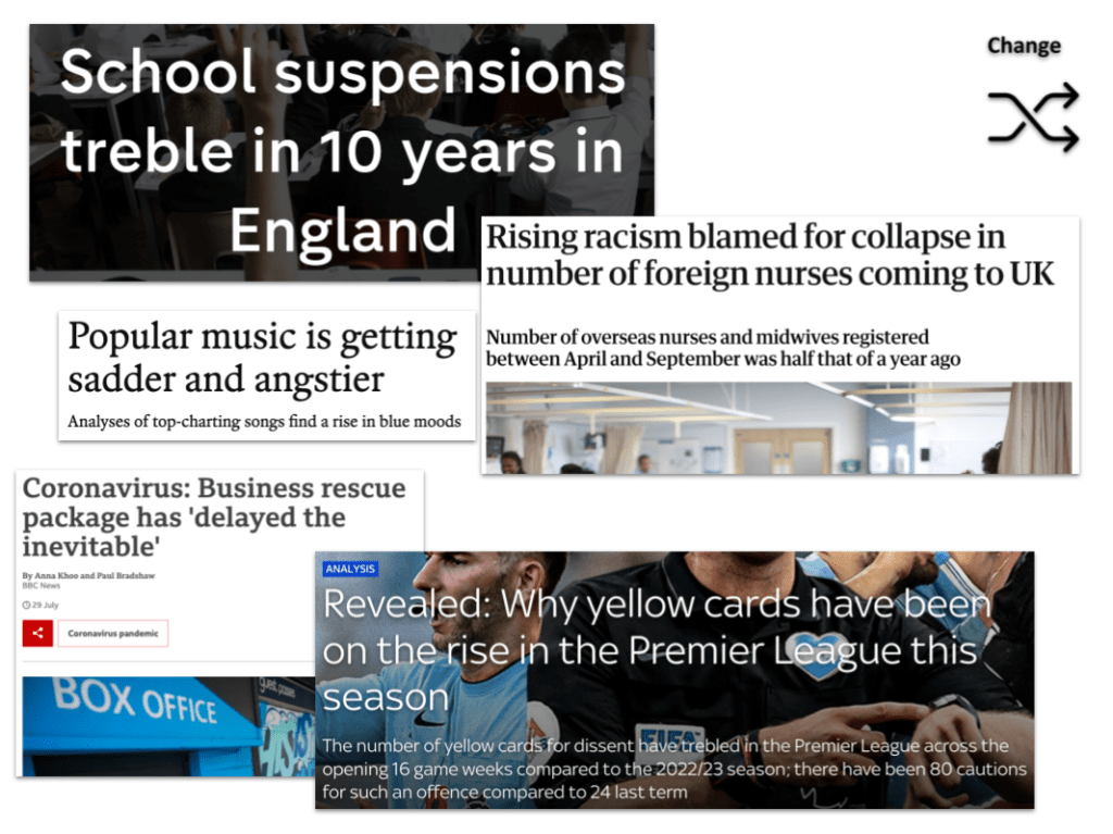 The Economist article above, for example, is about the top-ranked month for listening to gloomy songs. A Birmingham Live story, on the other hand, leads on The most common crimes in Sandwell – and where you’re most likely to be a victim.