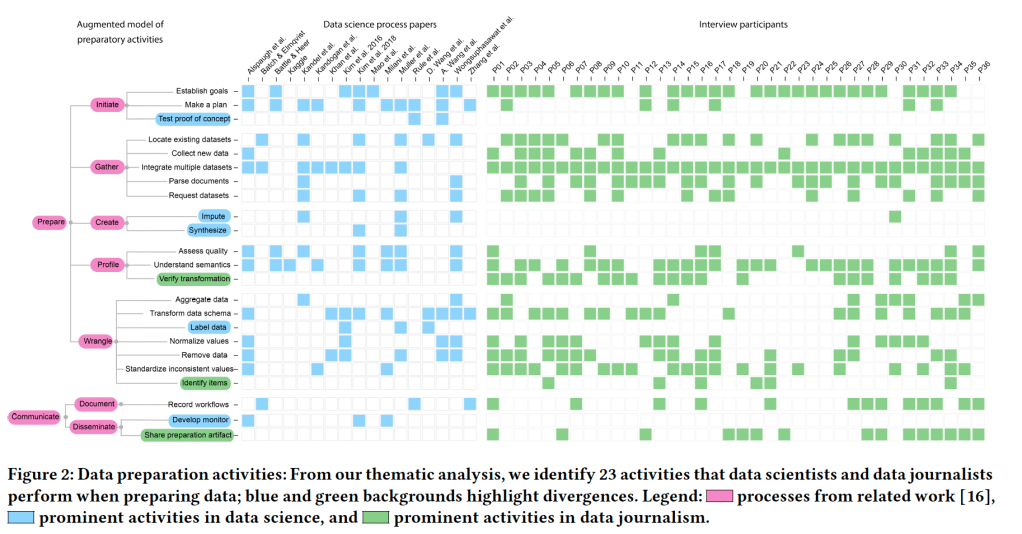 [UPDATE: April 2023] With perfect timing, a new research paper titled Dirty Data in the Newsroom: Comparing Data Preparation in Journalism and Data Science maps the various data journalism cleaning workflows and data cleaning taxonomies, summed up in the impressive diagram below.