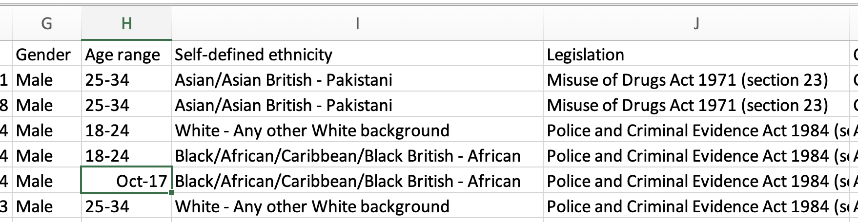 The first clue that you have dirty data is when it doesn’t look or behave the way you expect it to. Anyone importing stop and search data from the UK’s police data portal into Excel, for example, might notice that one of the categories in the age column shows as “Oct-2017”. Why would that be a category of age?