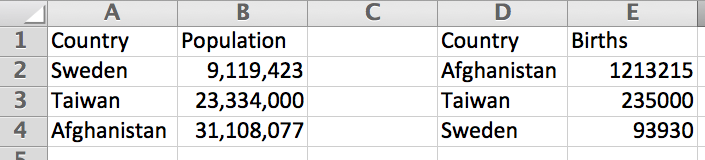 - In your spreadsheet, create two very simple tables on the same sheet, with an empty column between them. Give the first table the headings ‘Country’ and ‘Population’, and the second table the headings ‘Country’ and ‘Births’. We’re going to use VLOOKUP to grab the population from one table and put it next to the relevant country in the other.