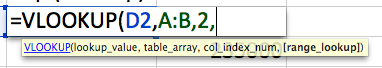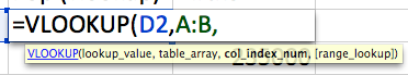 In the first cell of that new column, start typing the formula =VLOOKUP(. You’ll notice once you open the parenthesis, the tooltip appears telling you the ingredients this function needs.