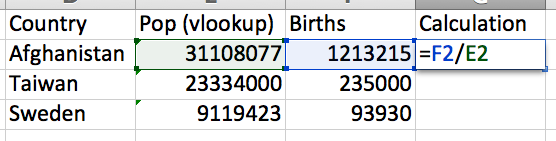 This means you can now write a simple calculation to divide the births by population to get a birth rate per head (or times that by 1,000 to get a birth rate per thousand).