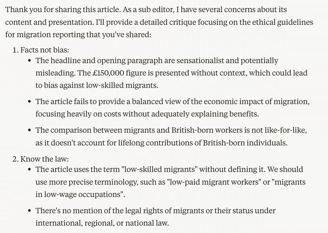 But the point of the detailed prompt isn’t to generate a to-do list; it’s to help look at the reporting through a number of different lenses. There might be some changes we can make to the article, some suggestions that we reject or adapt, and some that we can consider for future stories.