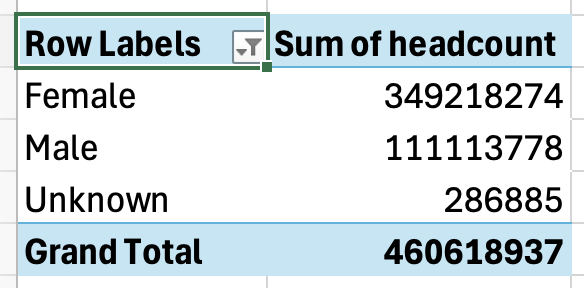 Whatever you want to total for each of those categories goes in the Values area of the pivot table (in this case there is a column called ‘headcount’ that we want to ‘sum’ for each sex)