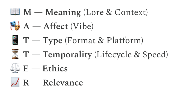 “It offers a fast, structured way to assess what a meme does, why it works, and whether it actually matters,” Bösch writes, encouraging reporters “to slow down, separate feeling from meaning, assess impact and ethical risk, and make a conscious editorial decision” before embedding or covering a meme.