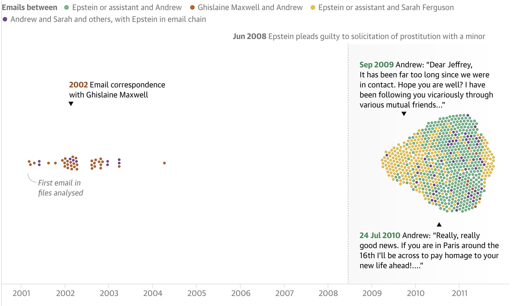 guardian_network_bubble ← Previous Next → The Guardian’s story on Epstein’s relationships uses a bubble chart with one axis to visualise connections with one person over time.