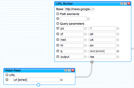 A grey wire linking the URL Builder and Fetch Feed modules ← Previous Next → A grey wire linking the URL Builder and Fetch Feed modules