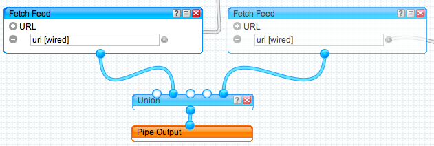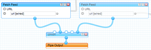 Wires connect the Fetch Feed modules to the Union module, which in turn is connected to the Output module ← Previous Next → Wires connect the Fetch Feed modules to the Union module, which in turn is connected to the Output module