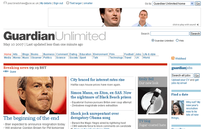 Today sees the Guardian Unlimited finally getting the makeover it’s been desperately needing since the print product made ‘Berliner’ a polite topic of conversation. For the moment it’s only the front page – as creative editor Mark Porter explains, it “will be a facade concealing a busy building site, as work proceeds on an 18-month programme to redesign and rebuild every part of GU.”
