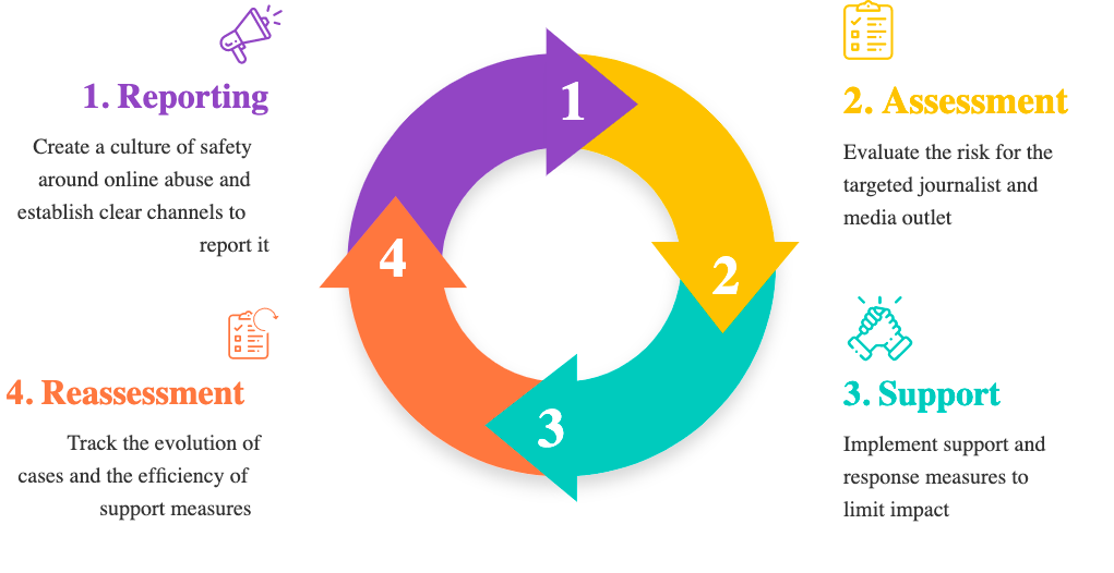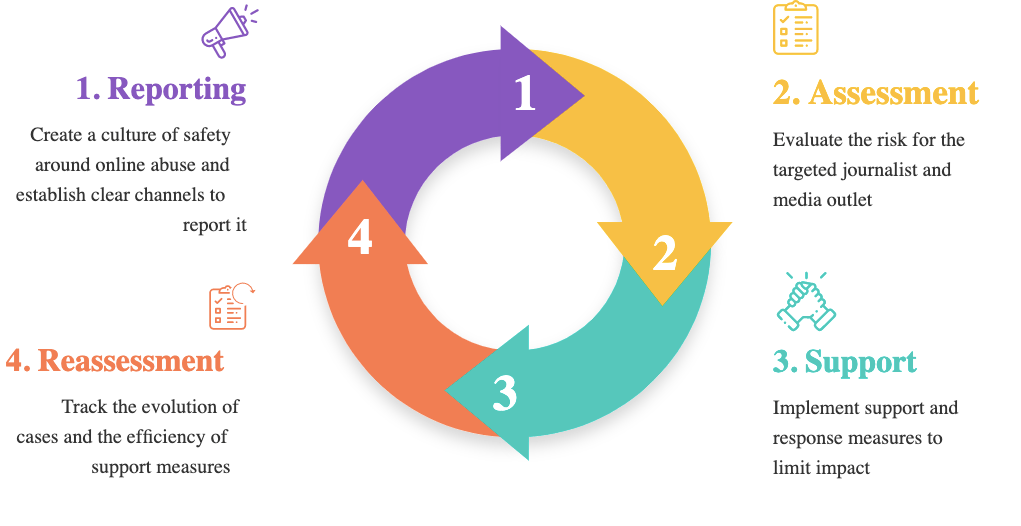 “The objective is to normalize discussions about online harassment in the newsroom,” they say. “An important step toward a creating a culture of safety. Journalists should feel comfortable coming forward with their experiences and concerns.”