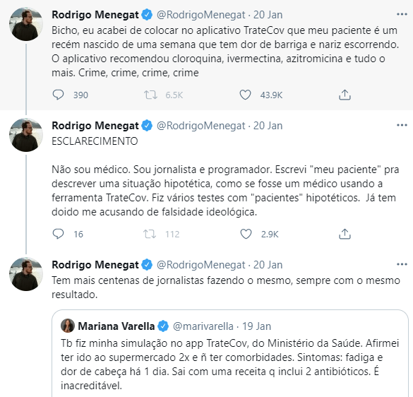 However, the data journalist Rodrigo Menegat analyzed the app’s source code and found that, regardless of the patient’s symptoms, age and health conditions, TrateCov indicated the use of chloroquine, hydroxychloroquine and ivermectin — drugs with no scientific evidence supporting their use in the treatment of coronavirus.