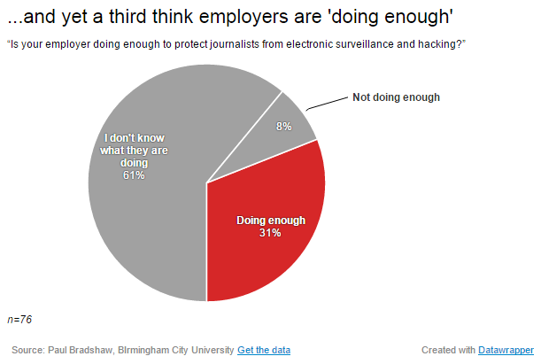 Journalists overwhelmingly said that they did not know what their organisation was doing about internet security. But perhaps more importantly, editors did not know either. “I should know the answer to that,” said one, “and it’s worrying that I don’t.”