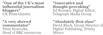 Comment, analysis and links covering online journalism and online news, citizen journalism, blogging, vlogging, photoblogging, podcasts, vodcasts, interactive storytelling, publishing, Computer Assisted Reporting, User Generated Content, searching and all things internet.